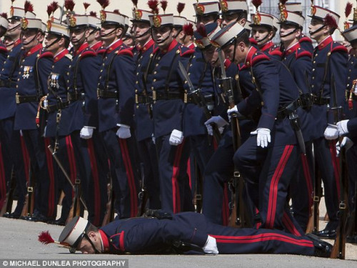 3月份,查爾斯和卡米拉訪問西班牙時一名儀仗隊人員的暈厥姿勢