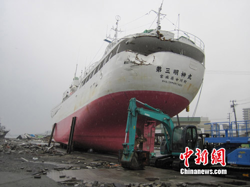 日本地震海嘯極重災區氣仙沼市,被沖上岸上的輪船隨處可見。 張明新攝