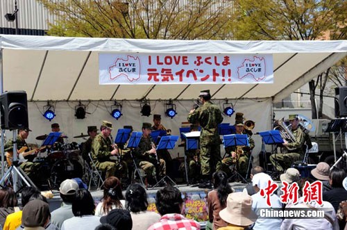 在離福島火車站不遠(yuǎn)的一個(gè)街心廣場里,正上演著一場“我愛福島”的聯(lián)歡活動(dòng),由前來救災(zāi)的自衛(wèi)隊(duì)男女隊(duì)員身著迷彩服登臺(tái)為市民演奏各類流行和勵(lì)志樂曲,其中一首《不要放棄,不怕失敗》。約有200名市民到場觀看,其中一些帶著孩子,隨著主持人感性的話語,陸續(xù)有人到一旁義賣的攤檔選購食品、小工藝品。在一旁的停車場上,還有四五輛軍車,士兵們歡迎市民登上裝甲車參觀、合影。
