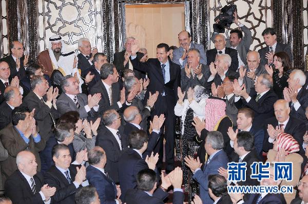 資料圖片 3月30日,敘利亞總統(tǒng)巴沙爾(后中)在敘人民議會致意。新華社/敘利亞通訊社