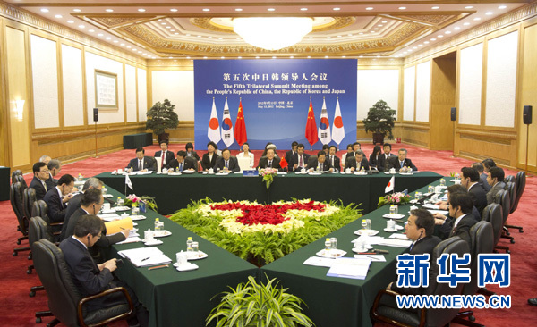 5月13日,第五次中日韓領(lǐng)導(dǎo)人會議在北京人民大會堂開始舉行。中國國務(wù)院總理溫家寶主持會議,韓國總統(tǒng)李明博、日本首相野田佳彥與會。新華社記者 黃敬文 攝