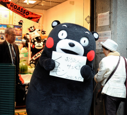 中新網(wǎng)5月18日電 據(jù)日媒報(bào)道,日本熊本縣的吉祥物“熊本熊(酷MA萌)”本月17日現(xiàn)身東京都中央?yún)^(qū)的該縣特產(chǎn)直銷(xiāo)店“銀座熊本館”,向支援熊本地震災(zāi)區(qū)的來(lái)店顧客表達(dá)謝意。