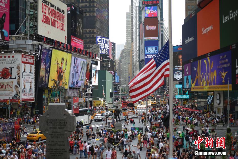 當?shù)貢r間7月8日下午,紐約時代廣場為達拉斯槍擊案殉職警察降半旗致哀。當日,美國總統(tǒng)奧巴馬下令所有政府建筑物降半旗5天,直至本月12日,以示對5名在達拉斯槍擊案中殉職的警察表達敬意及致哀。 中新社記者 廖攀 攝