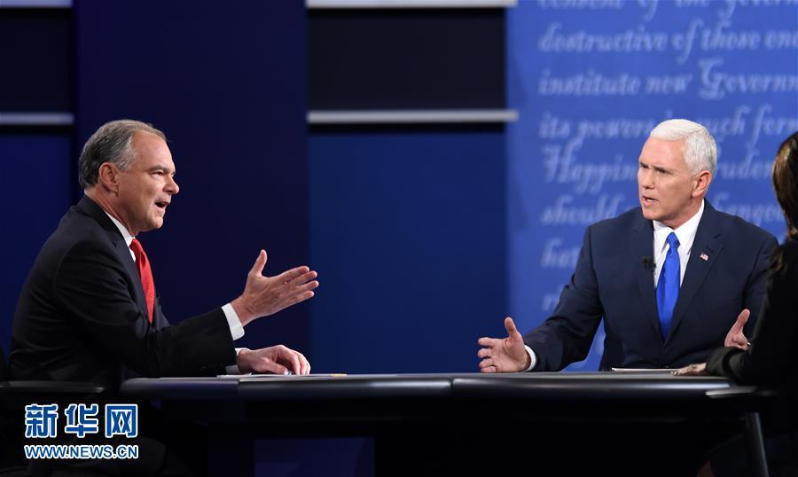 10月4日,在美國(guó)弗吉尼亞州法姆維爾的朗伍德大學(xué),特朗普的競(jìng)選搭檔、共和黨副總統(tǒng)候選人邁克彭斯(右)和希拉里克林頓的競(jìng)選搭檔、民主黨副總統(tǒng)候選人蒂姆凱恩參加2016年美國(guó)副總統(tǒng)候選人電視辯論。新華社記者鮑丹丹攝