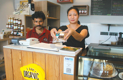 印度新德里一家小干果店已經支持使用手機掃碼支付,圖為柜臺前張貼著Paytm二維碼供顧客支付使用。記者 鄒松攝