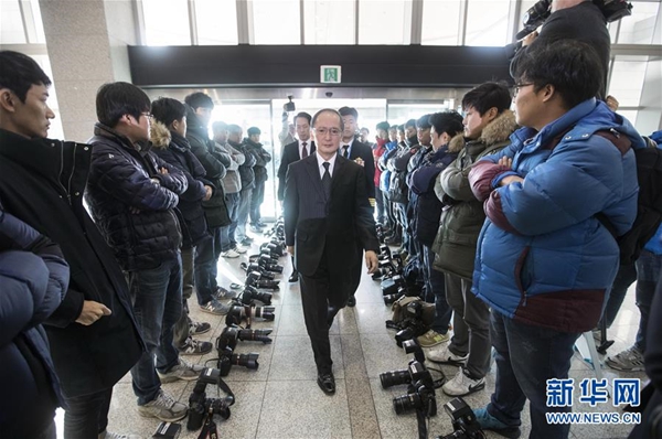 11月23日,在韓國首爾,日本駐韓大使長嶺安政(中前)前往韓日《軍事情報保護(hù)協(xié)定》簽署現(xiàn)場時,兩旁記者放下相機(jī)表示抗議。 新華社/紐西斯通訊社