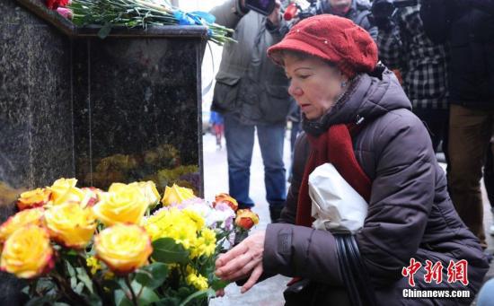 當地時間12月25日,俄羅斯民眾在亞歷山德羅夫紅旗歌舞團門口為圖—154空難遇難者獻花。中新社記者 王修君 攝