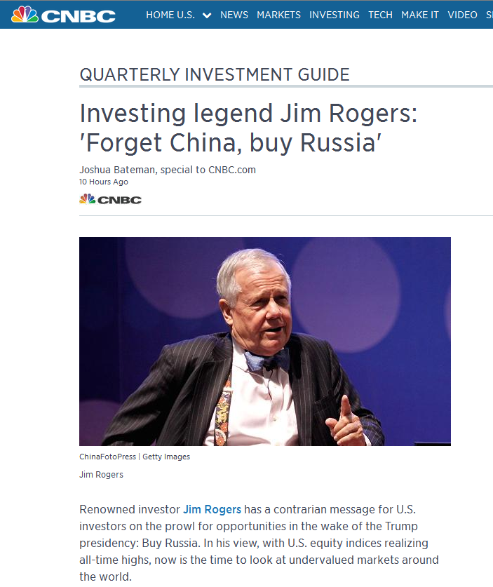 據CNBC10日報道,羅杰斯表示,特朗普效應將對美國股市向好發展有重大影響,盡管如此,國外的商機更值得重視。他再一次重申了美俄關系即將回暖的判斷,他認為雙方關系的改善將有力地推動經貿上的往來。
