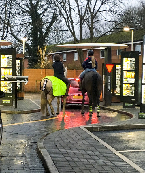 【環球網綜合報道】據英國《每日郵報》1月10日報道,近日,家住英國曼徹斯特的女子艾米麗·洛伊爾(Emily Royle)遇見了一件讓她哭笑不得的事,在她去麥當勞汽車餐廳購買午餐時,竟然在滿是汽車的等待隊伍中看到了兩匹馬。