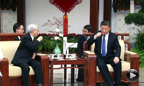 1月12日,中共中央總書記、國家主席習(xí)近平在人民大會堂同越共中央總書記阮富仲舉行會談,指出中越兩國都是共產(chǎn)黨領(lǐng)導(dǎo)的社會主義國家,是具有戰(zhàn)略意義的命運共同體。在兩黨兩國幾代領(lǐng)導(dǎo)人精心培育和大力推動下,中越兩國人民結(jié)下了“同志加兄弟”的友誼。會談后,兩黨總書記進(jìn)行了茶敘,暢談中越共通的茶文化,共敘兩黨兩國關(guān)系未來。