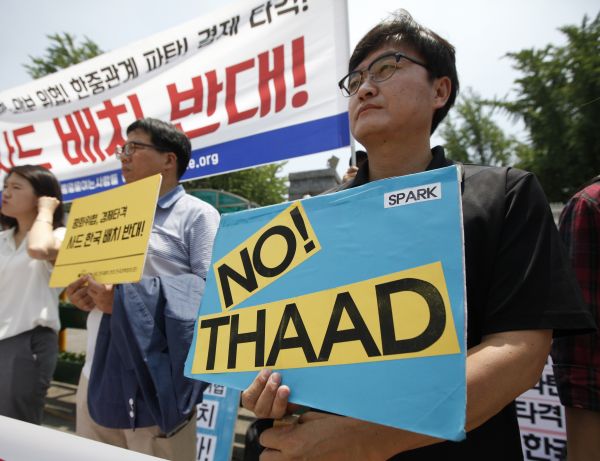 資料圖片:韓國市民團體高舉標語反對韓美在韓部署“薩德”系統(tǒng)。新華社記者姚琪琳攝
