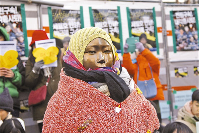 刺骨的冷風吹得行人拉緊了衣領,將手縮進口袋匆匆前行。同樣被裹得嚴嚴實實的,還有佇立在日本駐韓國大使館門前的“慰安婦”和平少女像,人們給銅像穿戴上了帽子、口罩、圍巾。和平少女像象征著那些曾經受巨大心靈創傷的韓國慰安婦們,民眾不愿銅像再受刺骨嚴寒的侵襲。