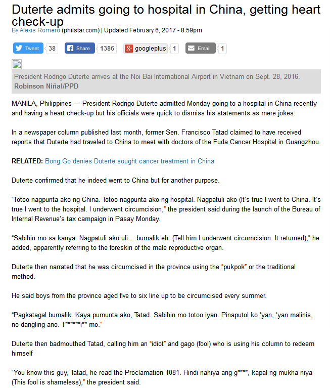 【環球時報-環球網報道 記者 郭芳】《菲律賓星報》6日報道稱,菲律賓總統杜特爾特當天承認,其近期曾前往中國醫院。他還透露,自己剛剛做了心臟檢查。但隨后總統府官員迅速做出否認,稱總統所說只是玩笑。