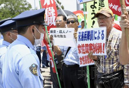 資料圖:沖繩縣民眾在美軍嘉手納基地前抗議。(共同社)
