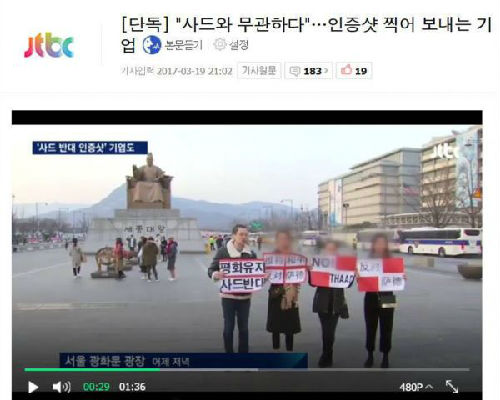 據(jù)韓國JTBC電視臺報道,一家韓國化妝品企業(yè)近日自覺選擇“站隊”,其員工在首爾市區(qū)公開舉行示威活動,他們舉著用中英韓文寫的“反對薩德”的標語,以表明自己對于現(xiàn)政府部署“薩德”的反感。