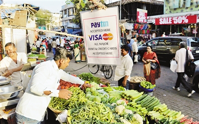 印度大力發展“無現金社會”,Paytm如今是世界排名第四的“電子錢包”,用戶達兩億,可用此系統支付的標識在印度隨處可見。圖為在印度孟買路邊賣菜攤上掛著Paytm的牌子。