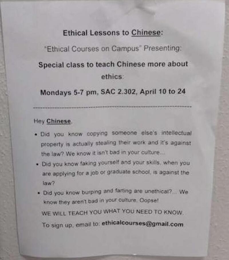 美國德州大學(xué)奧斯汀分校教學(xué)樓出現(xiàn)辱華布告,標(biāo)題為“給中國人上的道德課”。