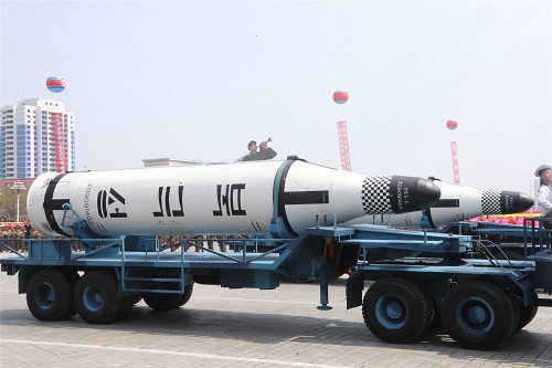 4月15日在朝鮮首都平壤舉行的閱兵式上拍攝的“北極星—2”型潛射中程彈道導彈。新華社記者朱龍川攝