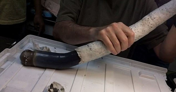 原來(lái),船蛆多鑿木而居,乍看之下,與平常的木頭并無(wú)兩樣。但當(dāng)研究者們敲開細(xì)長(zhǎng)的“象牙”后,它才現(xiàn)出原貌。一般情況下,船蛆會(huì)躺在木頭里啃食著木屑,過(guò)著漂洋過(guò)海的生活,但科學(xué)家們新發(fā)現(xiàn)的這條大家伙卻生活在泥漿中,依靠著潮濕腐爛的泥漿所滋生的細(xì)菌為生。