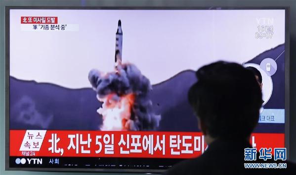 4月16日,在韓國首爾,一名男子在火車站觀看朝鮮試射導彈的新聞
