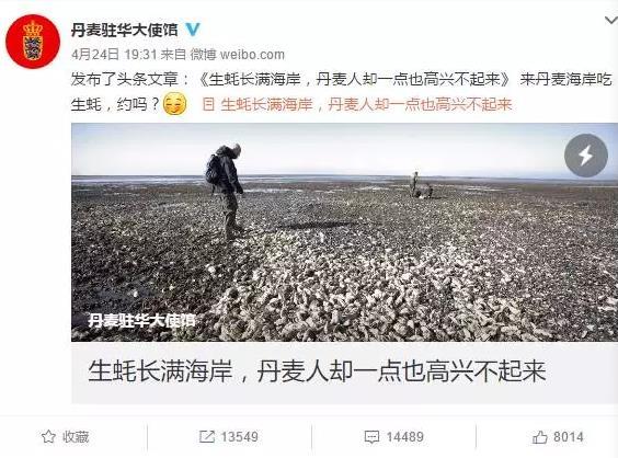 網(wǎng)友高漲的熱情讓這篇文章迅速走紅,截至發(fā)稿時(shí),轉(zhuǎn)發(fā)數(shù)量已經(jīng)過(guò)萬(wàn)。但同時(shí),也有網(wǎng)友發(fā)出了質(zhì)疑的聲音:發(fā)表這篇文章的目的,是不是為了營(yíng)銷(xiāo)呢?為此,記者前往丹麥駐華使館進(jìn)行了采訪(fǎng)。使館媒體公共外交文化參贊表示,發(fā)表文章的初衷是因?yàn)榍∏傻渿?guó)內(nèi)最近正在熱議太平洋生蠔外來(lái)物種入侵的問(wèn)題。他們并沒(méi)有想到文章會(huì)引起如此熱烈的反響。不過(guò)丹麥大使館表示他們很喜歡這個(gè)驚喜,因?yàn)橥平樽约簢?guó)家本來(lái)就是各駐外使館的重要工作。