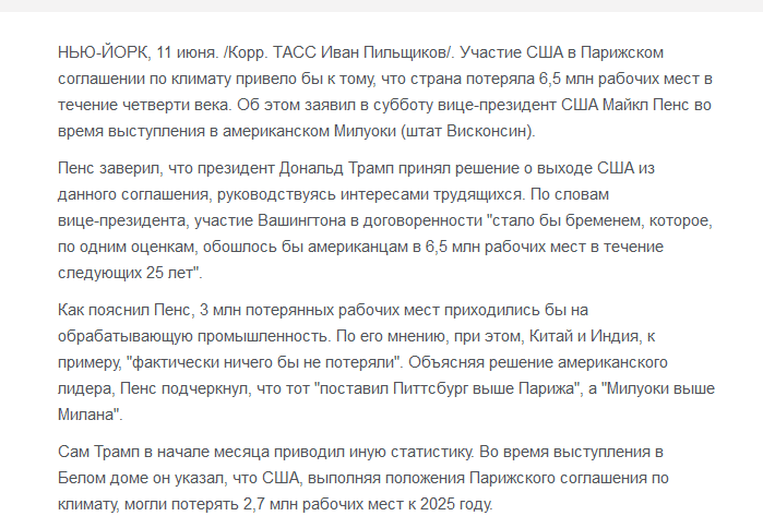 【環(huán)球網(wǎng)報(bào)道 記者 朱佩】美國(guó)總統(tǒng)特朗普此前表示,美國(guó)退出《巴黎氣候協(xié)定》,并將就在這一領(lǐng)域的新協(xié)議展開(kāi)談判。對(duì)于退出該協(xié)定,美國(guó)政界人士持不同觀(guān)點(diǎn)。其中美國(guó)副總統(tǒng)邁克 彭斯表示,美國(guó)因加入《巴黎氣候協(xié)定》可能會(huì)失去650萬(wàn)個(gè)工作崗位。