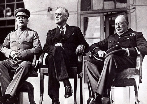 資料圖片:二戰(zhàn)時(shí)期的斯大林(左)羅斯福(中)與丘吉爾。