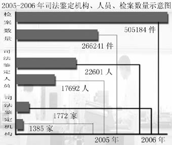據司法部司法鑒定管理局統計:2005年,除西藏自治區外,全國審核登記的法醫類、物證類、聲像資料(含計算機司法鑒定、電子物證司法鑒定)司法鑒定機構共1385個,至2006年底增至1772個,增長率為27.9%;執業司法鑒定人共17692人,至2006年底增至22601人,增長率為27.7%;司法鑒定業務的檢案數量為266241件,至2006年增至505184件,增長率為89.7%。