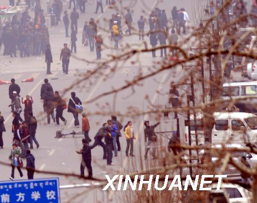 3月14日中午,在拉薩市朵森格路,不法分子在向路邊商鋪、汽車扔石頭。這是一起駭人聽聞的嚴重暴力犯罪事件。3月14日,一群不法分子在西藏自治區首府拉薩市區的主要路段實施打砸搶燒,焚燒過往車輛,追打過路群眾,沖擊商場、電信營業網點和政府機關,給當地人民群眾生命財產造成重大損失,使當地的社會秩序受到了嚴重破壞。事后查明,這天,不法分子縱火300余處,拉薩908戶商鋪、7所學校、120間民房、5座醫院受損,砸毀金融網點10個,至少20處建筑物被燒成廢墟,84輛汽車被毀。有18名無辜群眾被燒死或砍死,受傷群眾達382人,其中重傷58人。拉薩市直接財產損失達24468.789萬元。 這是一場反對分裂,維護祖國統一和民族團結的斗爭。 為了盡快恢復正常的社會秩序,西藏自治區黨委、政府組織公安、武警,對在拉薩街頭十分猖狂地進行打砸搶燒的不法分子依法打擊,迅速平息了事態,維護了社會穩定,維護了國家法制,維護了西藏各族群眾的根本利益。根據目前掌握的情況,這起嚴重的暴力犯罪事件是由達賴集團有組織、有預謀、精心策劃煽動的,是由境內外“藏獨”分裂勢力相互勾結制造的。 新華社記者 格桑達瓦 攝