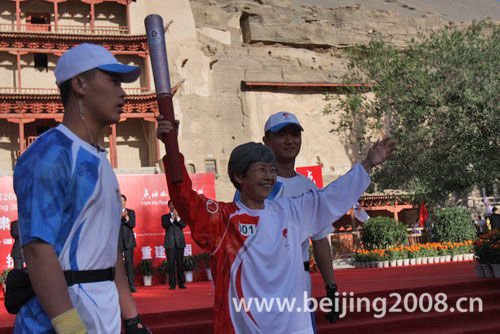敦煌傳遞將有120名火炬手、26名護(hù)跑手參加,首棒火炬手是素有“敦煌女兒”之稱(chēng)的敦煌研究院院長(zhǎng)樊錦詩(shī)。樊錦詩(shī)現(xiàn)任敦煌文物研究院院長(zhǎng),主要致力石窟考古、石窟科學(xué)保護(hù)和管理。在傳遞之前樊錦詩(shī)表示:“奧運(yùn)火炬?zhèn)鬟f是一個(gè)交流和傳遞的過(guò)程,敦煌是中外文化交流的地方,也是文化傳播的地方,奧運(yùn)火炬的到來(lái),傳播了敦煌文明和中華文明,能傳遞奧運(yùn)圣火我感到無(wú)比自豪。”