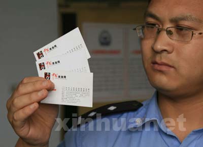 公安干警展示假記者名片(行唐縣公安局王錄軍攝)