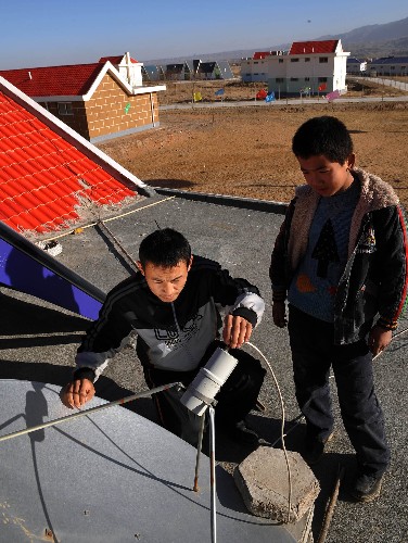 12月9日,寧夏中衛市沙坡頭區迎水橋鎮沙坡頭村村民童建楊(左)在自家屋頂上檢查電視接收天線。寧夏“塞上農民新居”第二個五年計劃提前出爐,新規劃總投資約11.59億元。寧夏自2005年實施“塞上農民新居”工程建設以來,新建示范點242個、農宅20319戶,改善了農民居住條件。新華社記者 劉泉龍 攝