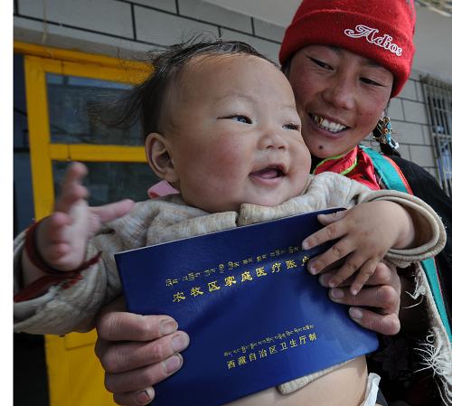 西藏那曲縣香茂鄉一名農牧民帶孩子到鄉衛生所看病(10月29日攝)。2008年,國家再次提高了西藏農牧民免費醫療補助標準,在過去年人均100元的基礎上,西藏農牧民免費醫療標準達到了年人均140元,其中中央補貼125元。據了解,西藏和平解放、特別是改革開放以來,國家已累計撥款超過18億元用于發展西藏醫療衛生事業,每年用于農牧民的醫療補貼超過2000萬元。新華社記者 覺果 攝