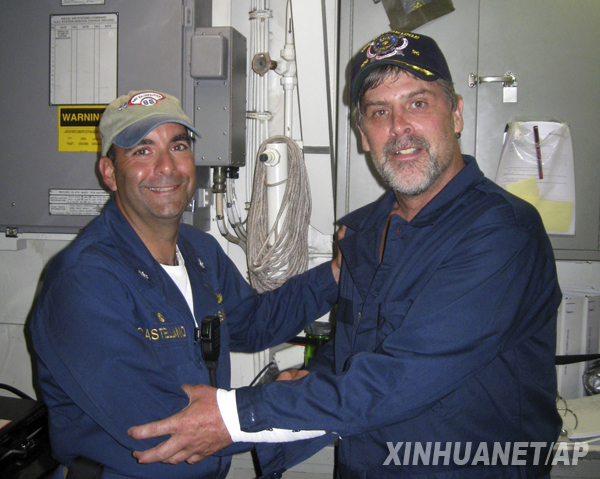 這張4月12日美國海軍發(fā)布的照片顯示的是被索馬里海盜劫持的美國船長理查德?菲利普斯(右)在獲釋后與美國海軍船艦的一名指揮官合影。美國媒體12日報道,8日被索馬里海盜劫持在一艘救生艇上作為人質(zhì)的美籍丹麥貨船船長理查德?菲利普斯已經(jīng)獲釋。 新華社/美聯(lián)