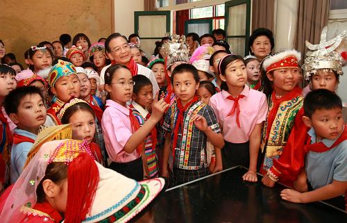 “五十六個民族,五十六朵花……”伴隨著《愛我中華》的樂曲聲,溫總理和孩子們手拉手歡快地跳起舞蹈。