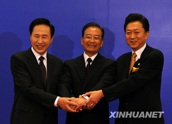 新華網(wǎng)北京10月10日電(記者廖雷、戰(zhàn)艷、干玉蘭)第二次中國、日本、韓國領導人會議10日在北京人民大會堂舉行。中國國務院總理溫家寶、韓國總統(tǒng)李明博、日本首相鳩山由紀夫出席會議。會議由溫家寶主持。在友好、務實的氣氛中,三國領導人回顧總結了中日韓合作10年歷程,展望規(guī)劃了三國合作的未來,并就共同關心的國際和地區(qū)問題深入、坦誠地交換了看法,達成廣泛共識。