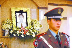 廣州保安詹斌因追搶匪而殉職,成為好保安的典范。圖為詹斌的追悼會現場。(資料圖片)