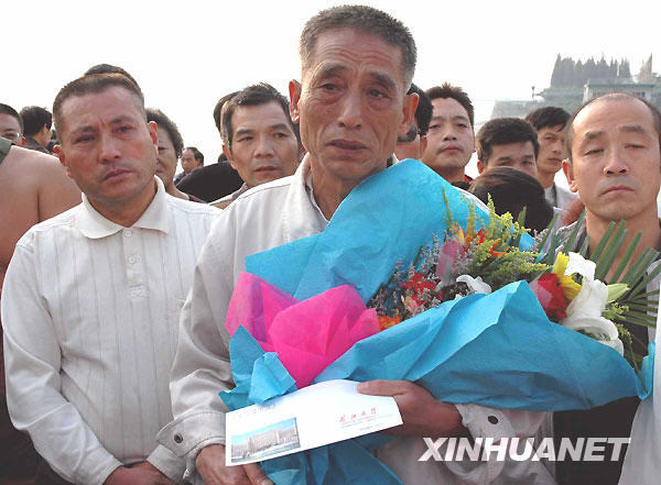 10月26日,參與救助落水大學(xué)生的61歲寶塔灣冬泳隊老隊員魯?shù)轮医舆^學(xué)生們致謝的鮮花后潸然淚下。新華社記者 魏夢佳 攝