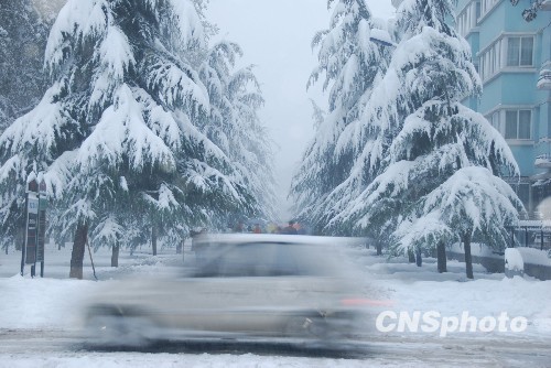 11月10日,石家莊降下初冬以來首場暴雪。降雪自11月9日夜開始,當日清晨大雪紛紛揚揚鋪天蓋地,把石家莊裝扮的銀裝素裹,樹梢、花草、建筑物上掛滿積雪。 中新社發 魏恒越 攝