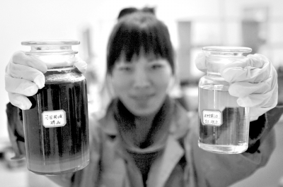 青海潔神環(huán)境能源產(chǎn)業(yè)有限公司工作人員在對(duì)比“地溝油”(左)和由餐廚垃圾處理而成的生物柴油。新華社記者 張宏祥 攝