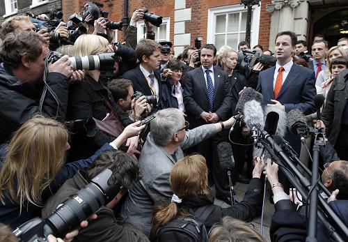 5月7日,英國自由民主黨領導人克萊格在英國倫敦向記者講話。英國大選計票工作當日下午結束,沒有一個政黨在議會贏得半數以上議席,從而形成自1974年以來第一個“無多數議會”。但保守黨議席數大大超過工黨,成為議會第一大黨。新華社/路透