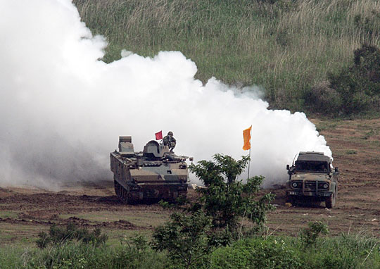 資料圖片 2009年6月4日,韓國(guó)海軍陸戰(zhàn)隊(duì)在韓國(guó)龍平島舉行大規(guī)模軍事演習(xí)。