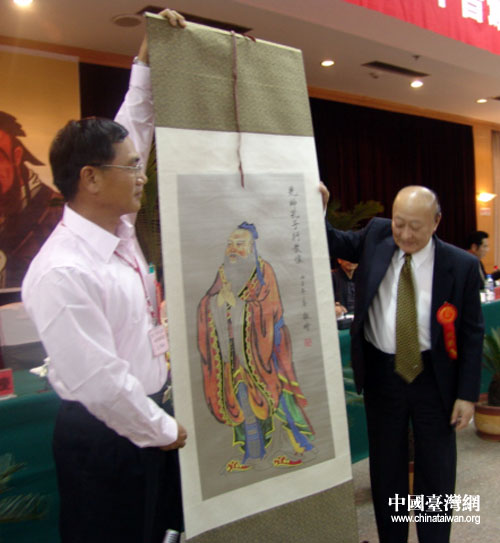 世界孔子后裔聯(lián)誼會(huì)會(huì)長孔德墉(右)向臺(tái)灣分會(huì)贈(zèng)送孔子繡像