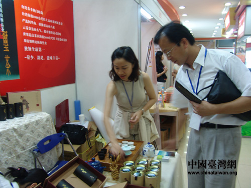 展會上的花東金針和土雞油蔥酥吸引了不少參觀者上前詢問,來自花東奇雞養生集團的負責人告訴記者,此次展銷會上展示的只是集團中的部分產品,還有許多特色產品沒有在此展出。會場另一端,有來自欣松集團的茶文化展示也吸引了不少參觀者,許多嘉賓一邊欣賞茶道表演,一邊品嘗香醇的臺灣特色茶葉。(陳寧)