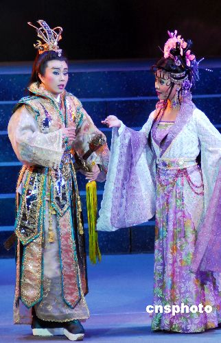 十一月三日晚,有臺灣“無敵小生”美譽的歌仔戲“頭牌”女藝人孫翠鳳(左)首度亮相上海,公演《劍神呂洞賓》,引發上海新老戲迷轟動。孫翠鳳所在的臺灣明華園是時下寶島首屈一指的歌仔戲劇團。繼1990年赴北京公演后,此番明華園將首度在上海、杭州、南昌、深圳等城市舉行規?涨暗膬鹊匮惭。 中新社發 明華園 攝