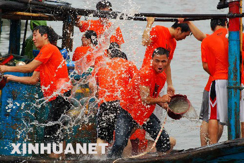 6月19日,漁民們正相互潑水,以示吉祥。當天,福建省石獅市蚶江古渡口,近2000人在100多艘漁船上潑水狂歡,慶祝端午節,吸引數萬觀眾觀看。福建石獅市蚶江傳承了300多年的競渡潑水鬧端午,已成為一種閩臺對渡文化習俗。每逢端午節,蚶江與臺灣鹿港兩地民眾身著節日盛裝,在海上舉行各種各樣的活動,駕船競渡,追逐潑水,驅熱消暑,祈求吉祥,寓意為人與船的大洗禮。 新華社發(顏財斌 攝)