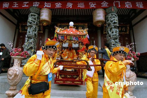 中新社福州一月八日電 (記者 黃翔)八日上午,福州蓮花山閩王紀(jì)念館舉行隆重的閩王金身巡安金門歡送儀式。閩王王審知金身巡安金門暨宗親文化交流訪問團(tuán)一行七十余人,九日上午將護(hù)送閩王金身經(jīng)廈金航線首次巡安金門,進(jìn)行為期四天的交流活動。