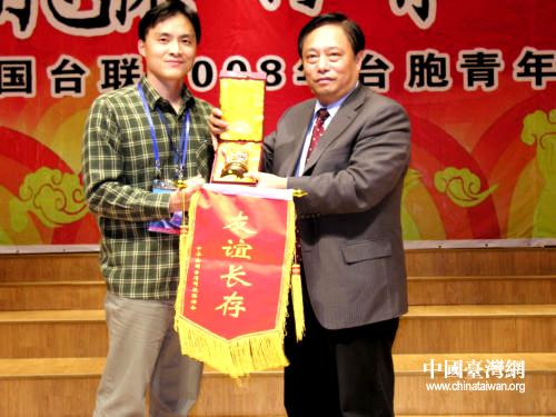 全國(guó)臺(tái)聯(lián)會(huì)長(zhǎng)梁國(guó)揚(yáng)與臺(tái)胞交換禮物