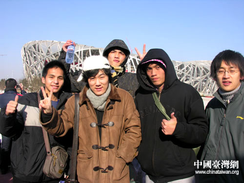 中國臺灣網1月23日北京消息 23日是08臺胞青年冬令營開營后活動的第一天。北京的冽冽寒風擋不住臺灣學子的高漲熱情,面對奧運場館“鳥巢”和“水立方”,臺胞青年興奮雀躍,驚呼震撼,深感自豪。