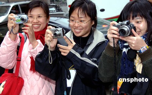 圖為參加2008榕臺青年冬令營的三名臺灣高校女學生用手中數碼相機捕捉榕臺青年交流畫面。
